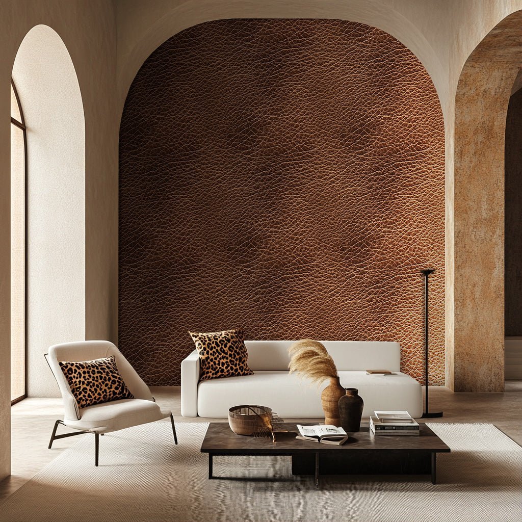 This wallpaper features a rich, textured leather effect in warm chestnut brown, reminiscent of a well-worn saddle. The subtle variations in tone and grain create an authentic, vintage look, adding depth and character to your walls. Perfect for creating a cozy study, rustic living room, or sophisticated accent wall, Aged Saddle pairs beautifully with wood and brass elements.