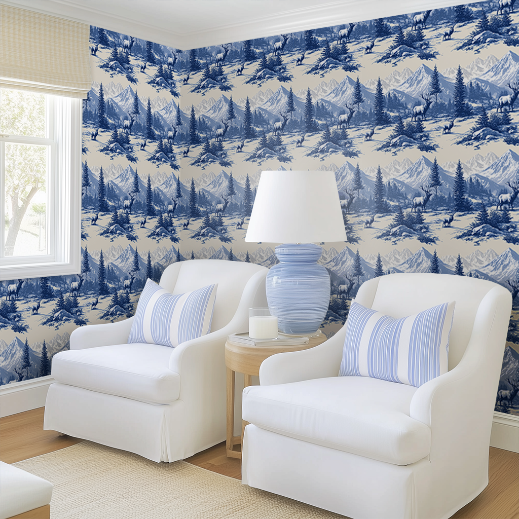 Transform your walls into a wintry mountain escape with Alta Wallpaper. Featuring playful blue elk frolicking through snowy peaks, this design brings the magic of winter indoors. Perfect for adding a cool, adventurous vibe to any room!