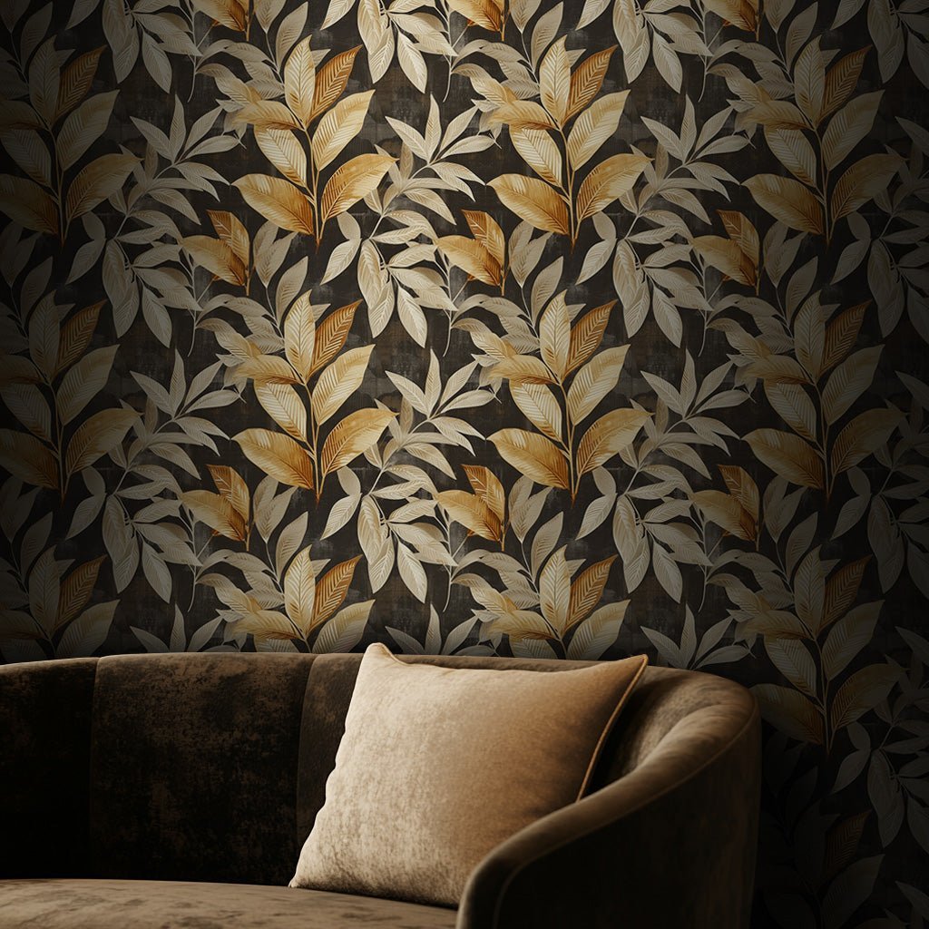 Our Angie Floral Wallpaper adds sophistication and warm addition to any space. With its rich palette of golden hues and deep browns set against a charcoal backdrop, this wallpaper design brings the serene beauty of fall's changing leaves indoors. Each leaf is intricately detailed, creating a lush tapestry that feels both organic and elegantly crafted.ÂÂ