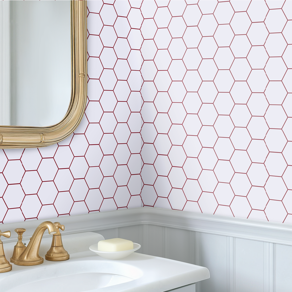 Add modern structure to your space with this honeycomb-inspired wallpaper, featuring a bold crimson geometric pattern on a fresh white backdrop. Its clean lines and repeating symmetry bring balance, energy, and sophistication to any wall. Ideal for accent spaces, offices, or contemporary living rooms, it makes a striking yet versatile design statement.
