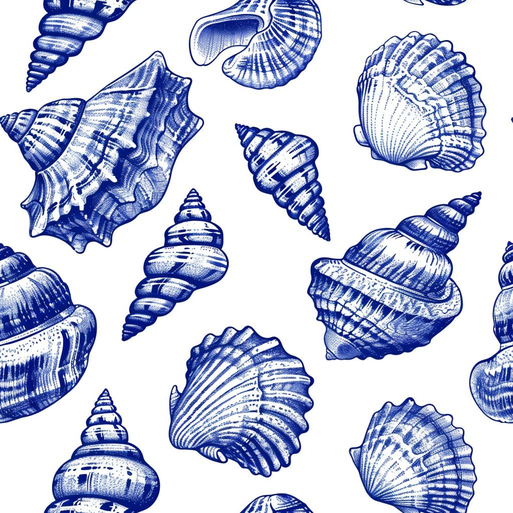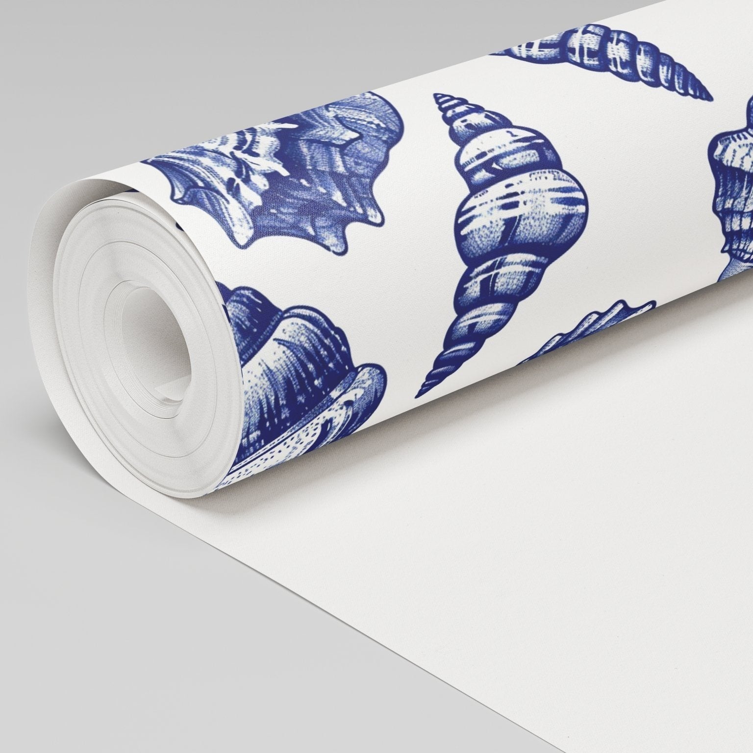 Embrace coastal serenity with 'Aurelia,' a pristine white wallpaper adorned with delicate blue seashells, inviting the soothing essence of the ocean into your home.