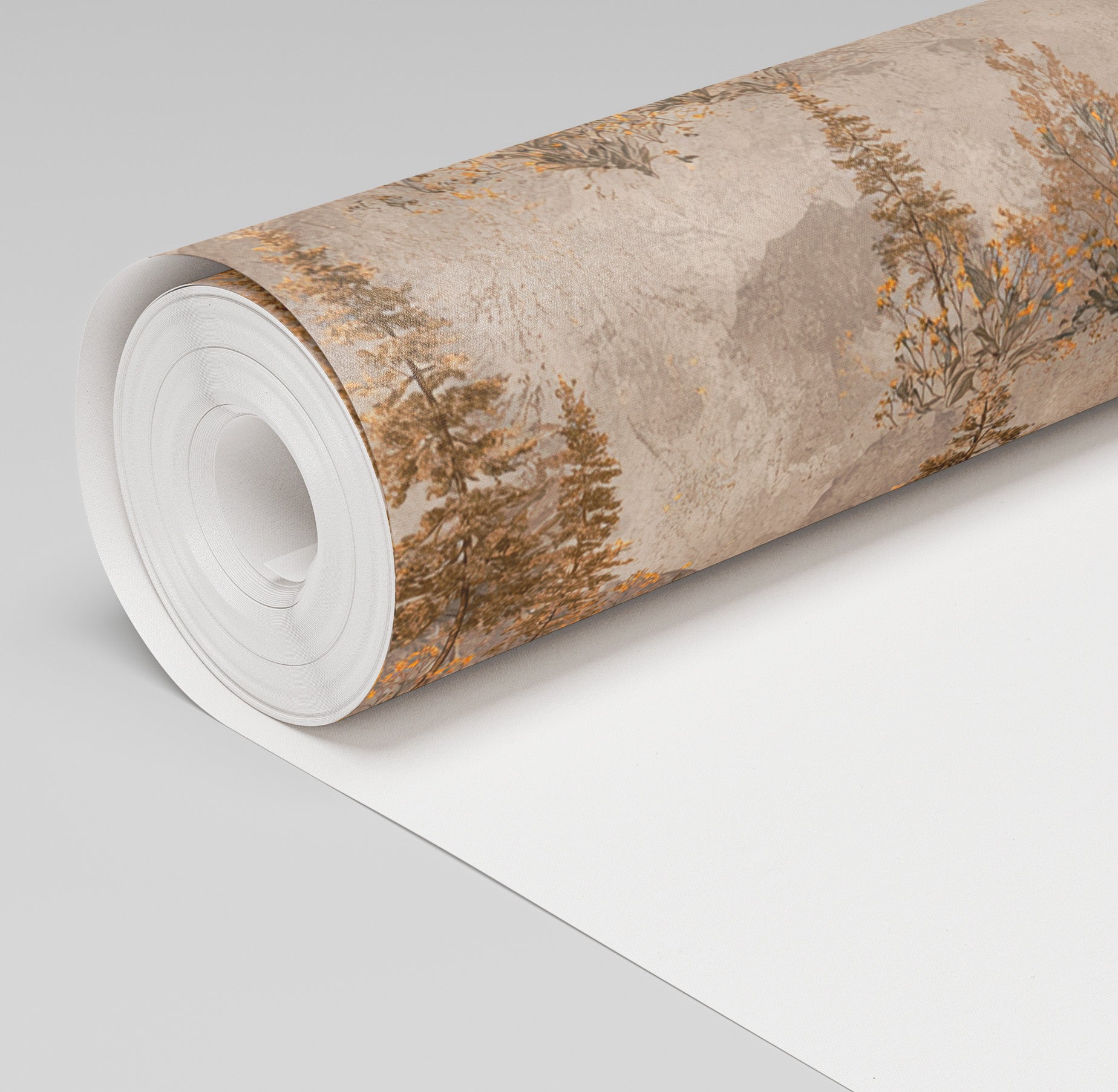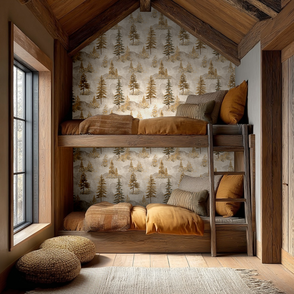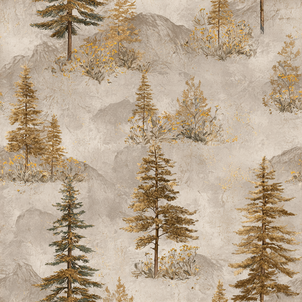 Blaine is a mountain landscape wallpaper with pine trees, golden blooms, and textured stone backdrops. Its layered design repeats to create a sense of depth and movement across a wall. With warm brown and muted gold tones, it evokes the rugged beauty of high-country terrain.
