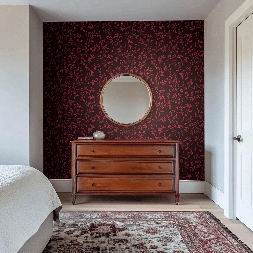 A delicate floral tapestry unfolds against a deep Bordeaux backdrop, creating a timeless yet contemporary statement. The intricate vines and blossoms offer a romantic allure, perfect for those who appreciate vintage charm with a modern twist. This pattern pairs beautifully with rich wood tones and metallic accents, elevating any space with its refined elegance. Whether in a cozy study or a stylish living room, Bordeaux Blossom evokes sophistication and warmth.