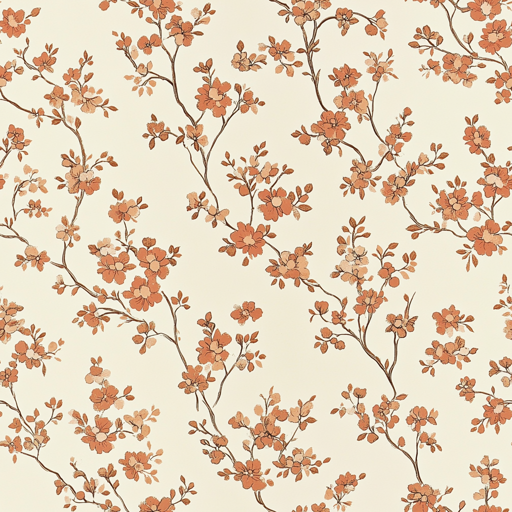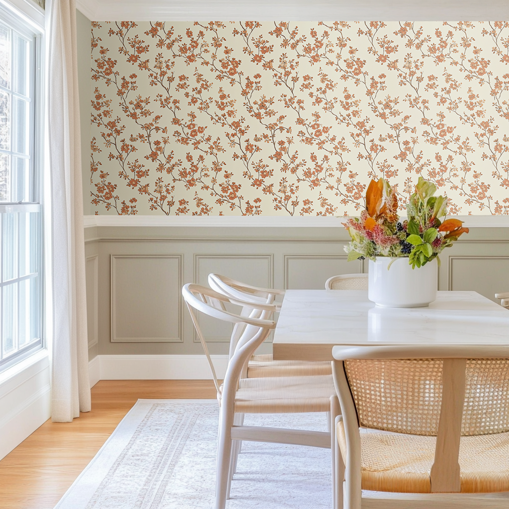 Warm rust florals trail across cream in Cabin at Dawn, like morning light streaming through cabin windows. This pattern feels both earthy and elevated—a cozy pick for bedrooms, kitchens, or even a home office.