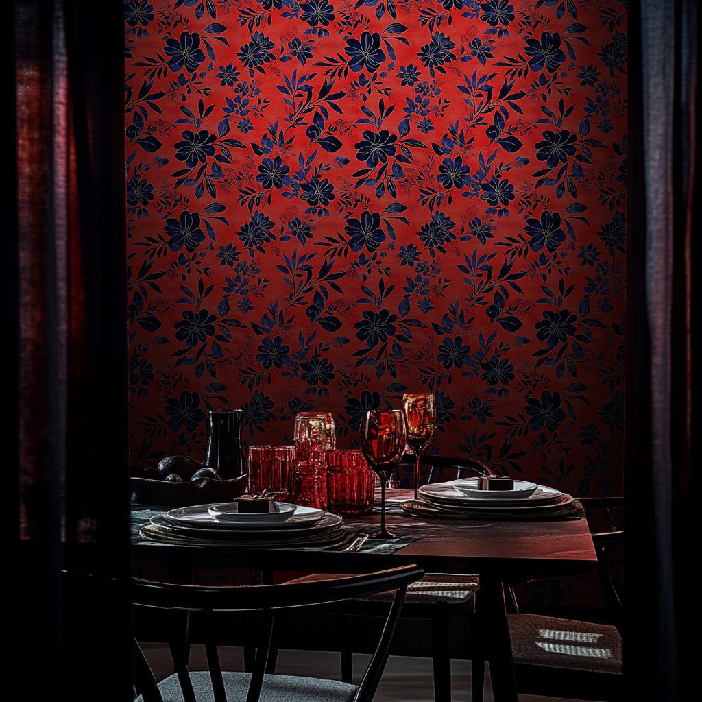 Introducing the Carmella Wallpaper. This striking wallpaper design features bold navy-blue florals and delicate foliage set against a vibrant, textured red background. The high-contrast color palette creates a dynamic and modern aesthetic, while the intricate botanical details add a touch of elegance. Perfect for making a bold statement, this design brings depth, energy, and sophistication to any space, from dining rooms to accent walls.