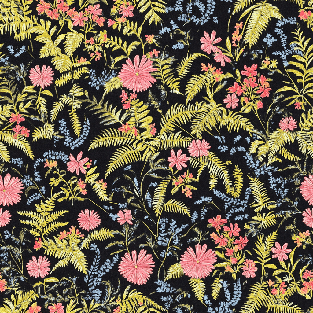 Delicate ferns and soft pink flowers bloom against a dark, moody backdrop, creating a timeless and romantic aesthetic. The intricate detailing gives a vintage feel, making it a great choice for classic and bohemian-inspired spaces. Its lush botanical pattern adds warmth and depth while remaining sophisticated. This wallpaper is perfect for those who appreciate a mix of nature and nostalgia.