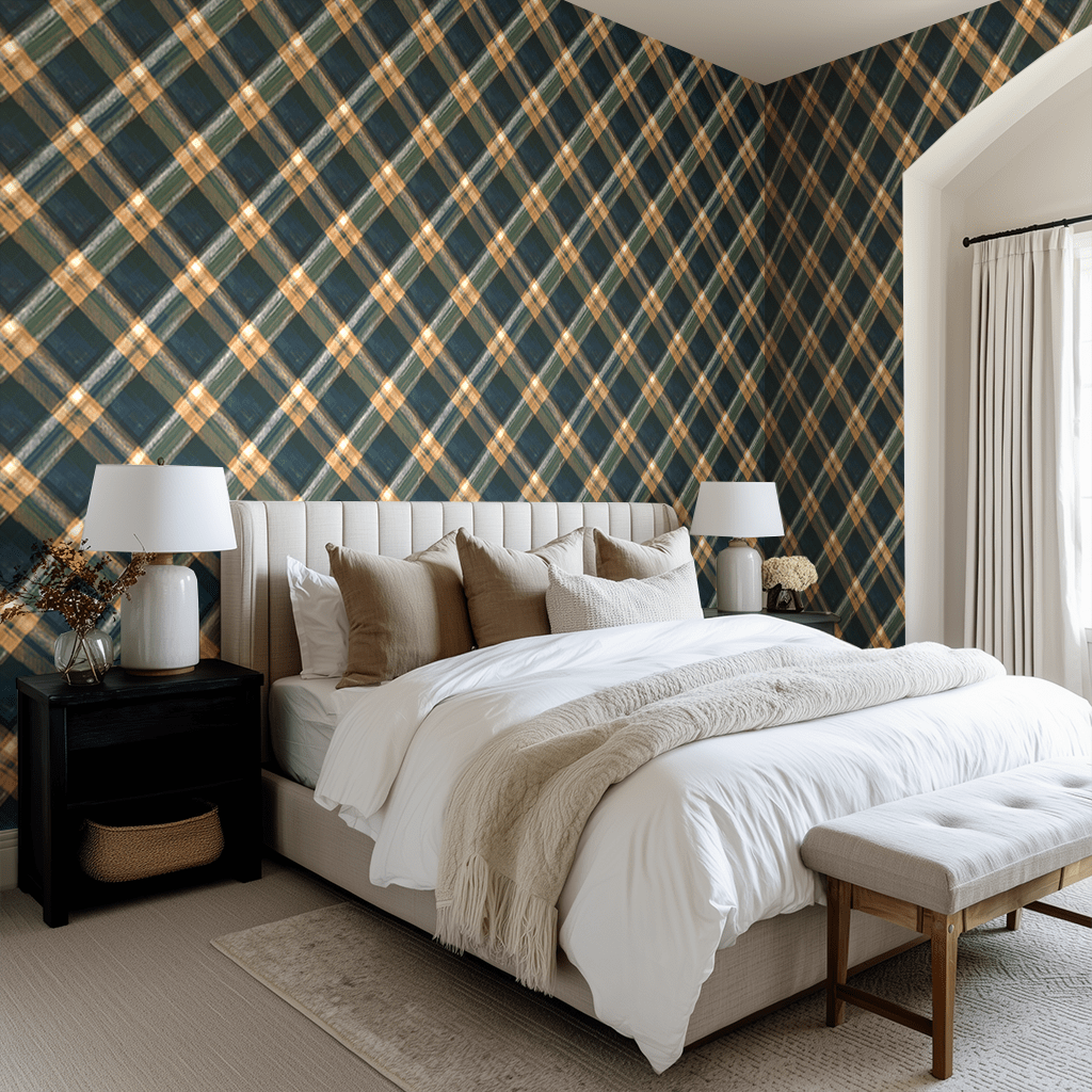 Bold and cozy, Curtis Wallpaper features classic plaid in an oversized layout with rich forest greens, golds, and deep blues. It’s a perfect pick for accent walls, studies, or moody powder rooms that call for a little rustic polish.