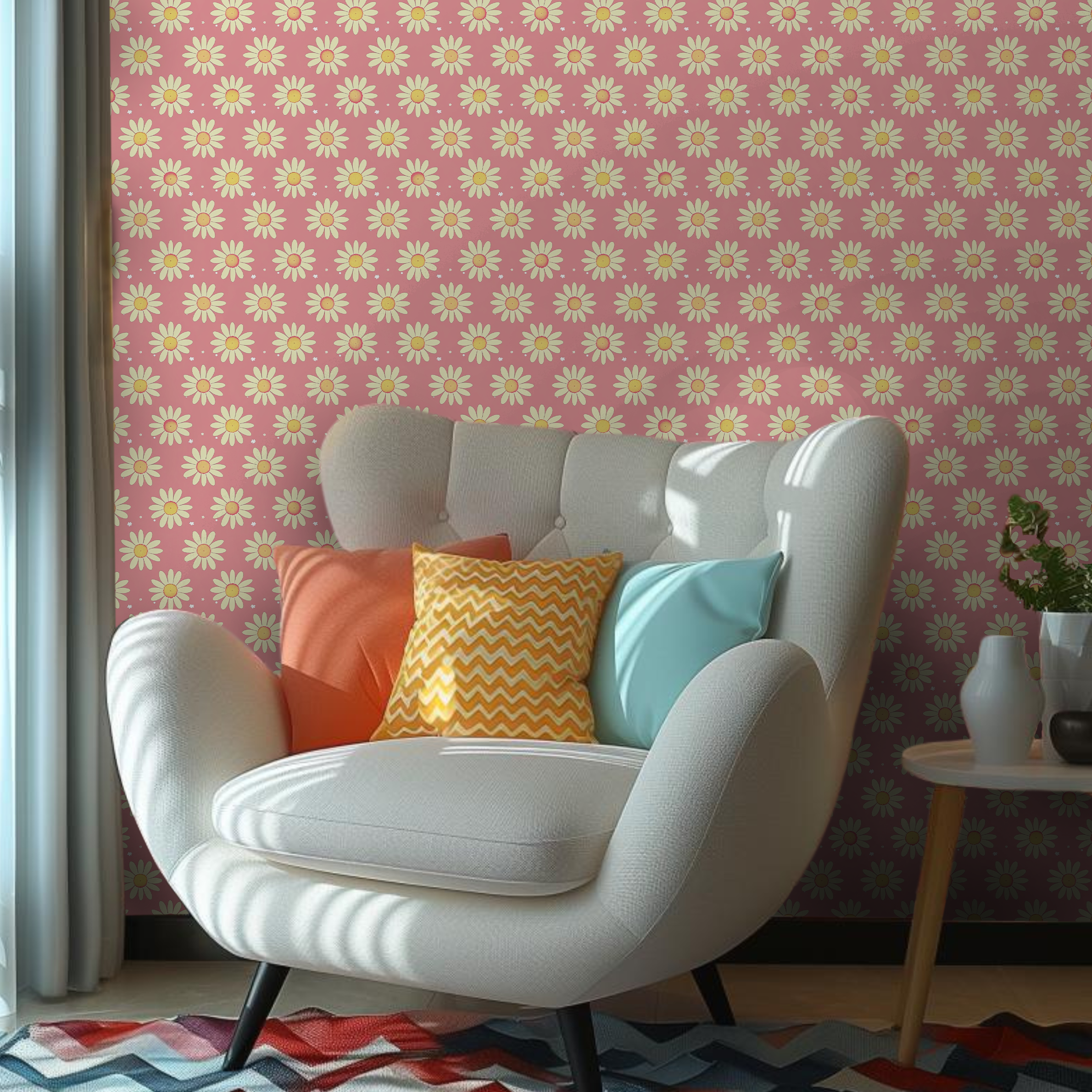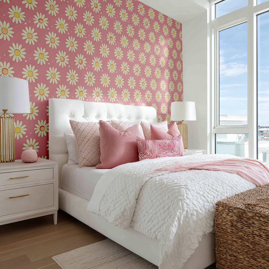 Where the charm of a sun-kissed field meets your chic urban nest. Adorn your space with this playful pink wallpaper, sprinkled with golden daisies, to turn that first apartment into a sweet retreat from the hustle.