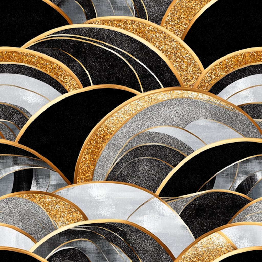 Introducing the Dean Wallpaper. This luxurious wallpaper showcases a captivating fan-like pattern with layers of black, silver, and gold. The elegant, curved design creates a sense of movement and depth, making it perfect for adding a glamorous, artful touch to any modern space. Ideal for feature walls or rooms where you want to make a bold, sophisticated statement.