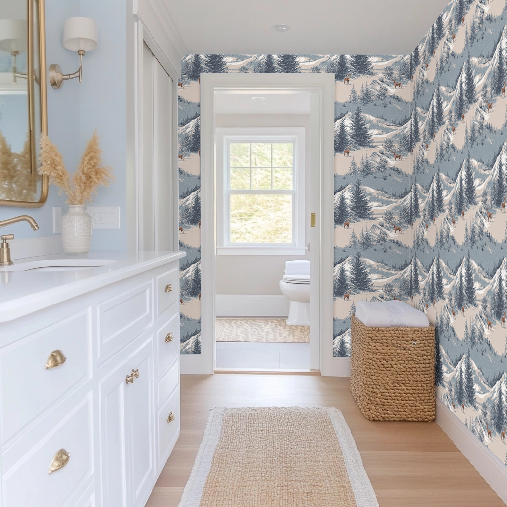 Bring a touch of winter magic to your walls with the Deer Valley Wallpaper. Featuring a playful blue deer amidst cool mountain hues, this design captures the serene beauty of snowy peaks and crisp winter air. Perfect for adding a refreshing, cool color vibe to any room, it’s like a cozy mountain escape right at home.