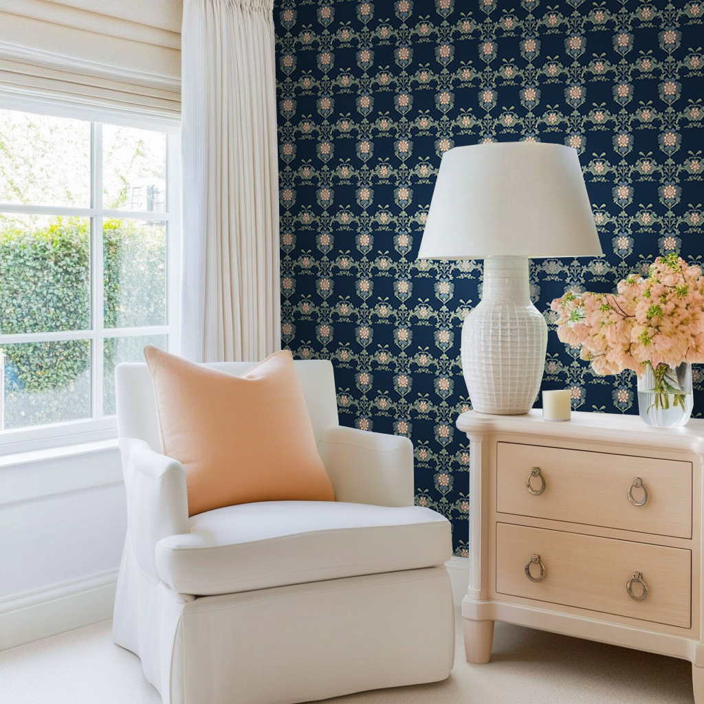 Delta is a rich, heritage-inspired wallpaper that features an ornate floral damask in soft rose and sage tones against a dramatic navy background. The intricate detailing and vintage elegance make it a perfect choice for creating moody, sophisticated spaces with a touch of old-world charm. Ideal for dining rooms, studies, or statement powder rooms, Delta brings timeless grandeur to any setting.
