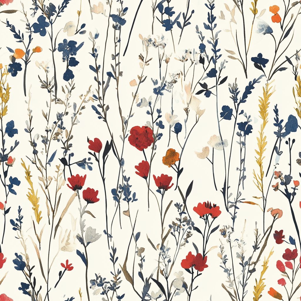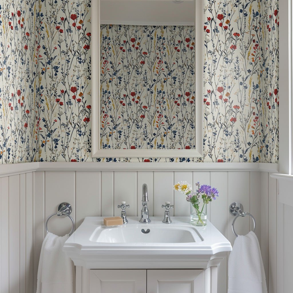 The Dovie Wallpaper is a vibrant and delicate design featuring a colorful array of wildflowers in rich reds, blues, and golds. Perfect for adding a lively, nature-inspired touch to any space, this wallpaper brings the beauty of a blooming meadow indoors.
