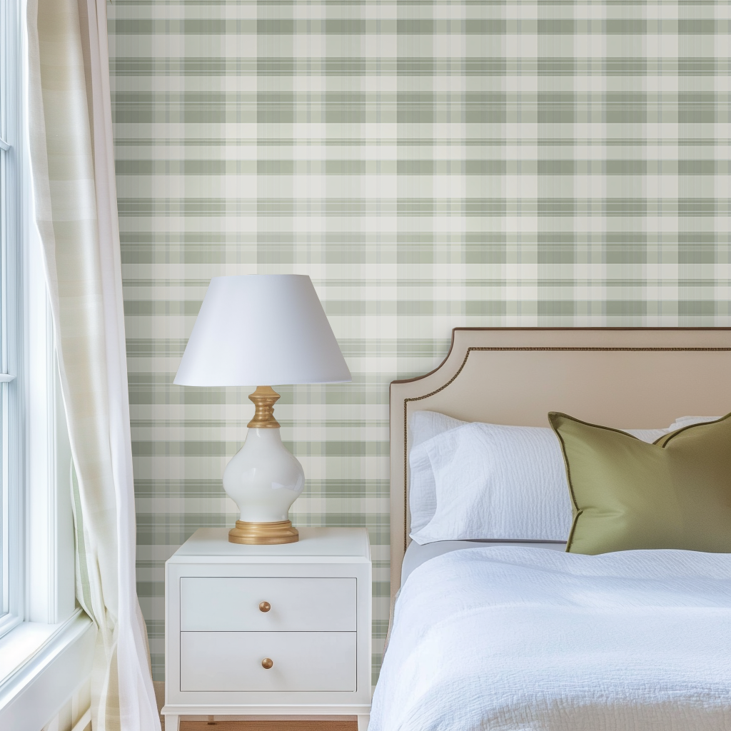 Ebbie is a soft, tailored plaid wallpaper that brings an airy sophistication to your space with its delicate sage and ivory palette. The subtle weave effect and classic pattern offer a timeless versatility, perfect for cozy kitchens, casual dining areas, or serene bedrooms. Ebbie’s gentle charm creates a warm, inviting backdrop with a modern-country feel.