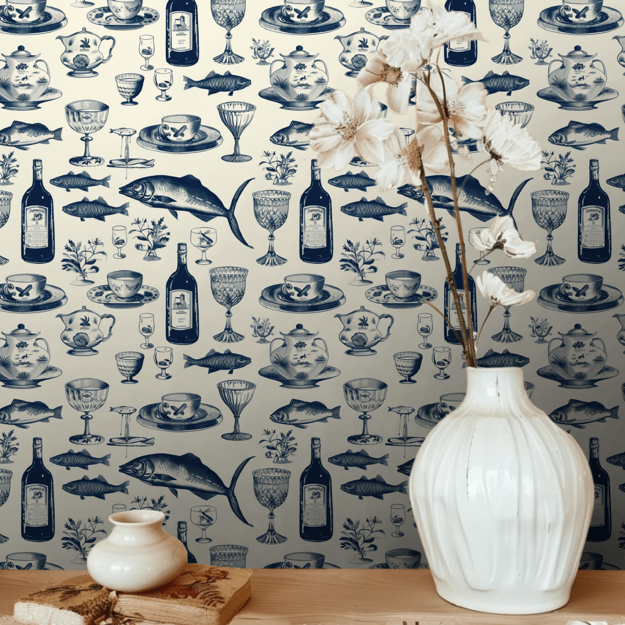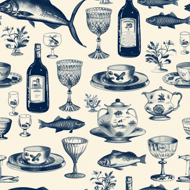 Step into a bygone era with Eleanor's Elegance, where vintage glassware and classic teapots mingle with marine life, evoking the charm of an aristocratic seaside banquet. Perfect for the hostess with a penchant for antique chic and the romance of the ocean.