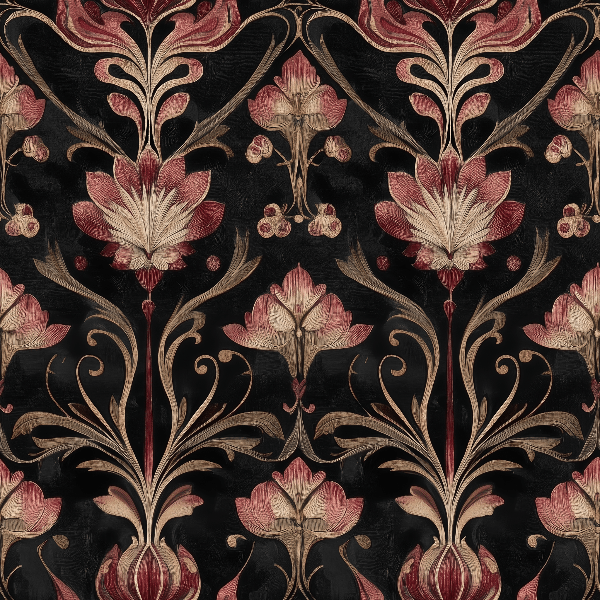 Estelle enchants with a blooming tapestry of blush and garnet petals unfurling over a deep black canvas. Its elegant, symmetrical design strikes a balance between romantic charm and dramatic allure. A perfect choice for bedrooms or powder rooms seeking a touch of vintage opulence and quiet boldness.
