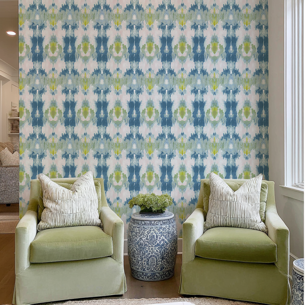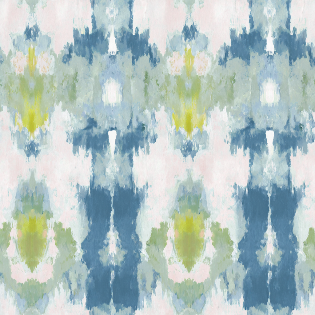 Evening Drift — This watercolor wallpaper brings a fresh twist to traditional geometric design with its soft pastel palette of blues, greens, blush pinks, and sun-washed yellows. Inspired by the expressive, organic geometry of Iwan Simonis, it features a large central motif flanked by smaller accents, echoing the symmetry of tie-dye or shibori techniques. With visible brushstrokes and a hand-painted texture, this pattern offers an artistic, textural depth that transforms walls into soft, dreamlike landscapes. Perfect for adding subtle structure and movement to bedrooms, creative spaces, or reading nooks.