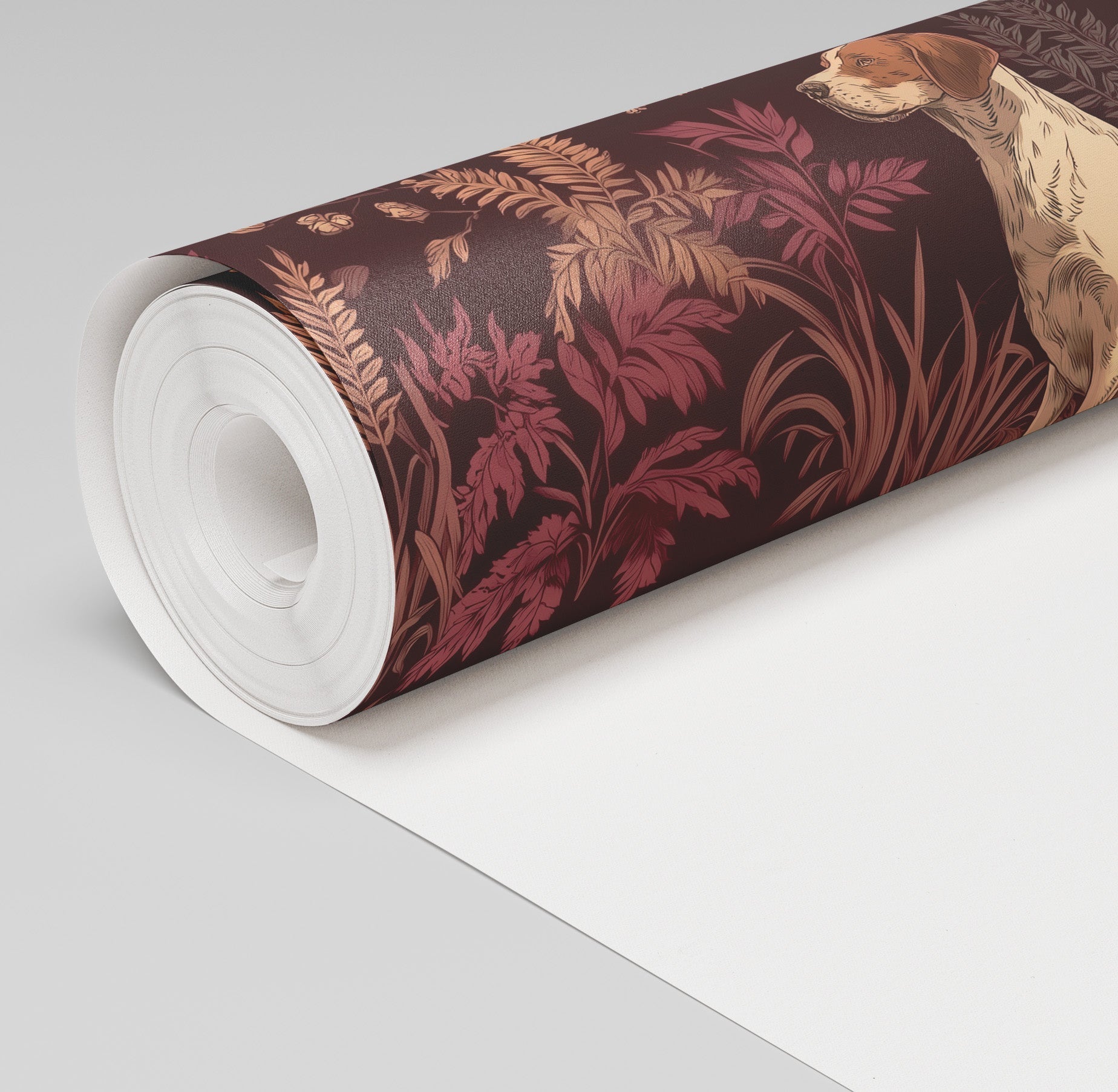 Fern & Fetch brings together the elegance of lush botanicals with the playful charm of pups. Rich burgundy grounds set the stage for detailed ferns, roses, and wild blooms in earthy tones, framing dogs in a way that feels both refined and whimsical. Ideal for dining rooms, libraries, or statement walls, this pattern balances natural romance with a touch of canine companionship.