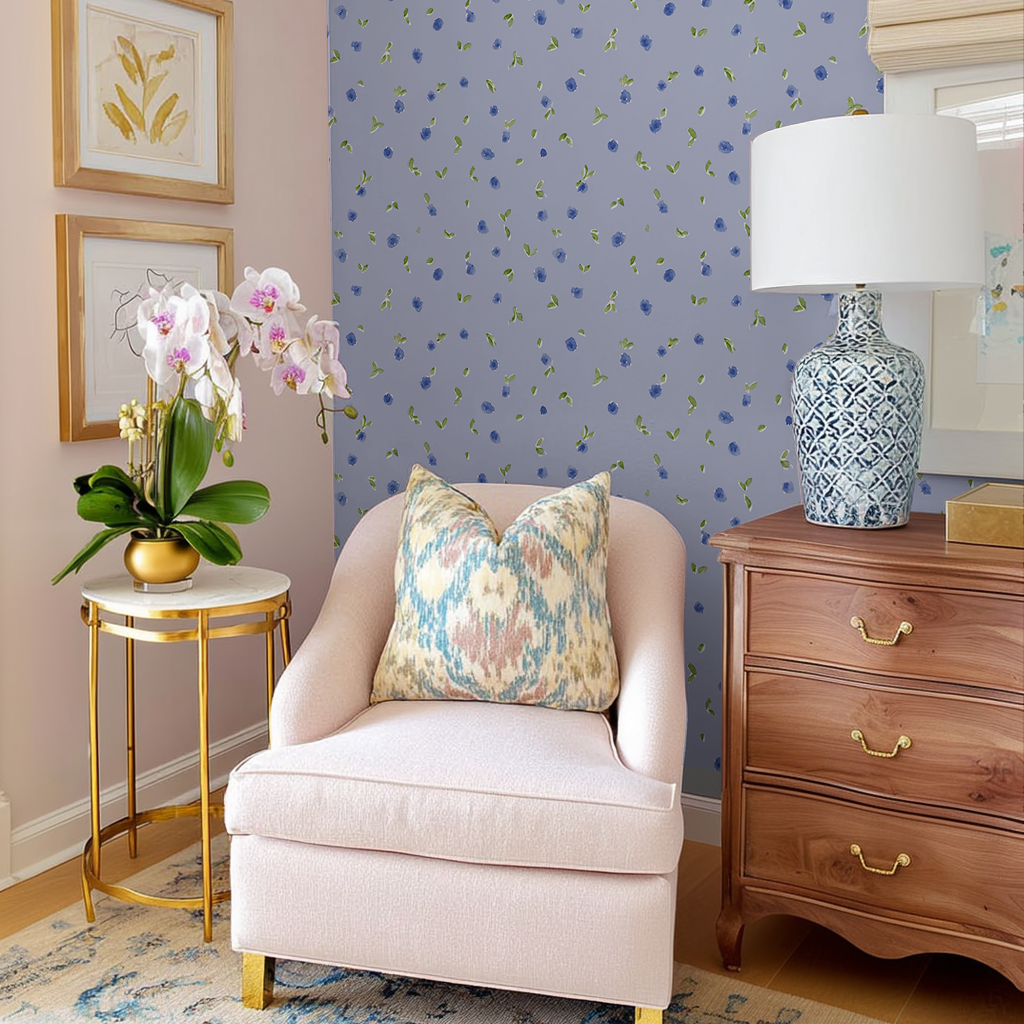 Brighten your space with Finley wallpaper, featuring playful blue and violet flowers with delicate small petals and fresh green leaves. This lively design adds a cheerful, whimsical touch to any room, creating an inviting and joyful atmosphere. Perfect for those who love a splash of color and nature-inspired charm on their walls.
