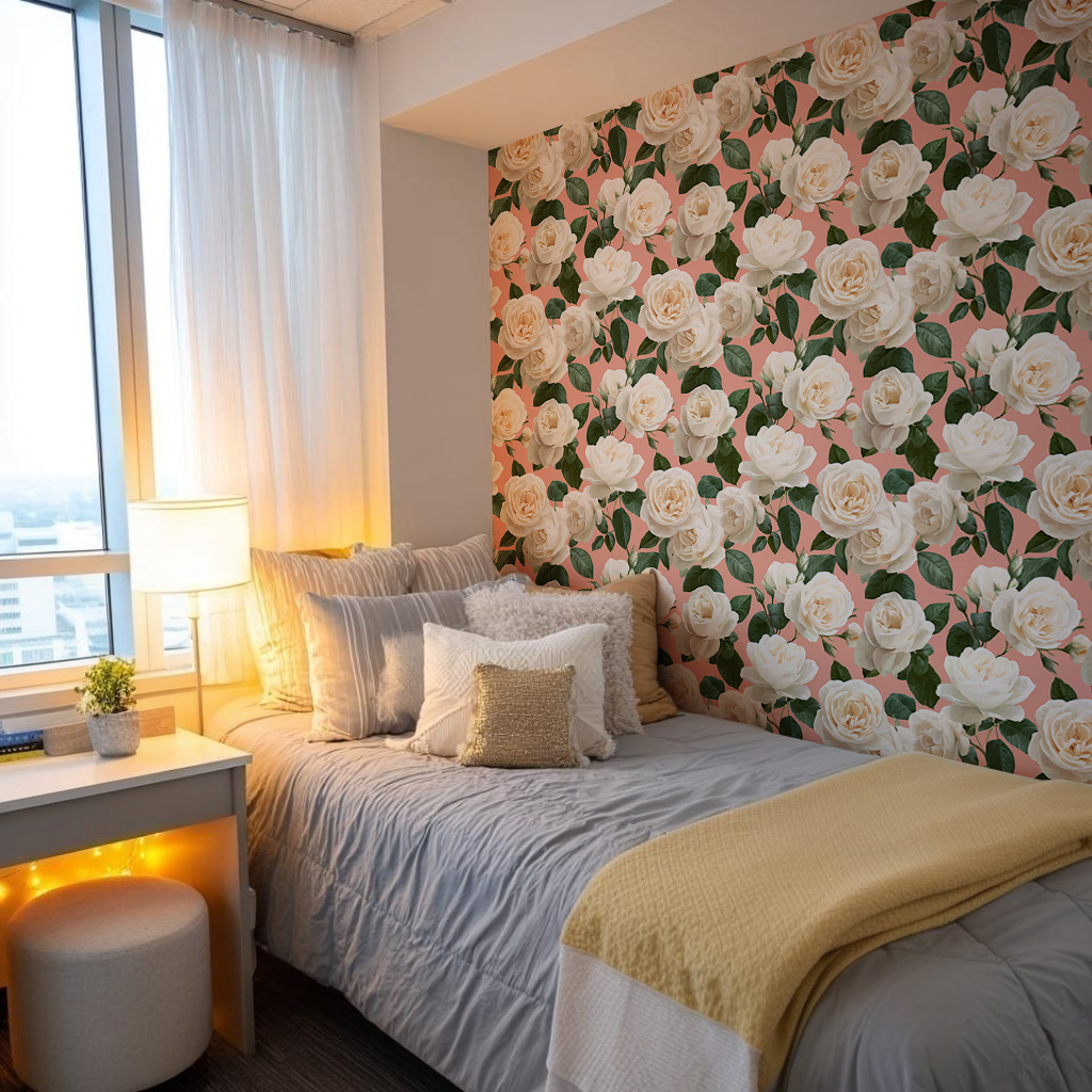 Full of soft elegance, Fresh White Bloom features creamy garden roses set against a warm blush-pink background. The classic floral repeat brings a feeling of romance and timeless beauty—perfect for bedrooms, dorms, or any space that could use a little softness. With rich green leaves and painterly details, this pattern is sweet but not too precious—just like your favorite vintage dress.