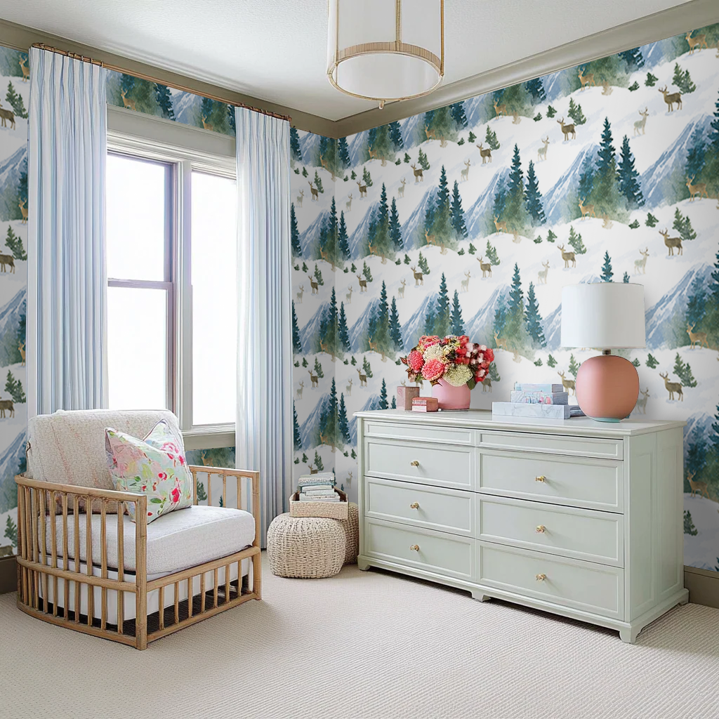 Bring the magic of winter indoors with the Front Range Wallpaper. Featuring playful deer amidst snow-dusted trees, this design blends cool blue and green hues to create a serene forest scene. Perfect for adding a touch of woodland whimsy to any room while evoking the crisp freshness of a snowy winter day.