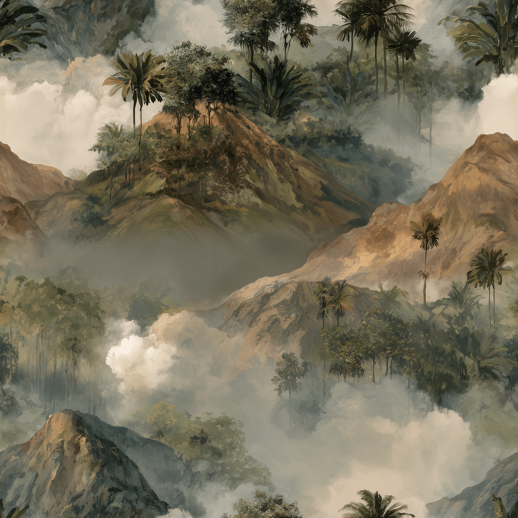 Galindo Wallpaper brings the raw beauty of volcanic landscapes into your home. This striking design features warm earth tones—rich browns and burnt oranges—layered with lush tropical greens that evoke misty mountain vistas. The rustic aesthetic captures the essence of untamed nature, creating depth and character on any wall. Perfect for spaces that crave warmth and organic sophistication, Galindo transforms ordinary rooms into immersive retreats inspired by the world's most dramatic natural wonders.
