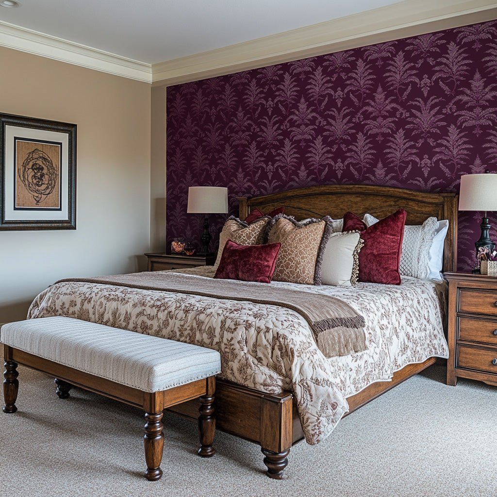 Rich burgundy and detailed fern motifs come together to create a luxurious and regal design. This wallpaper offers a bold statement, ideal for adding drama to dining rooms or bedrooms. The intricate fern details evoke the beauty of winter foliage, adding a natural yet refined touch. It's perfect for those who love a balance of classic and modern styles.