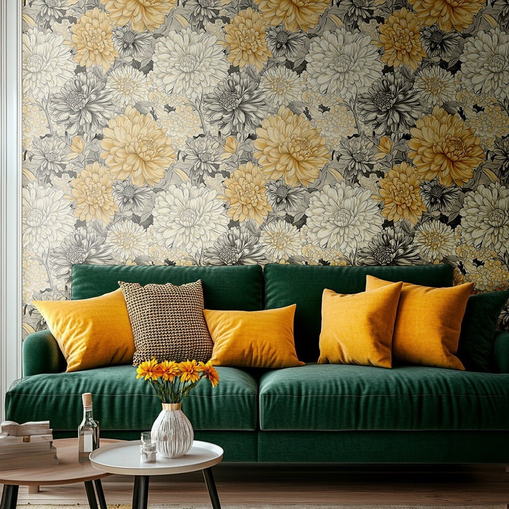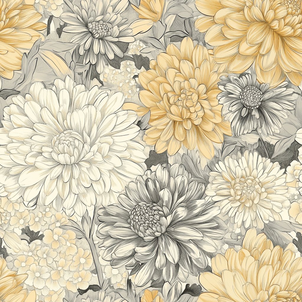 This intricately detailed chrysanthemum design in soft gold and gray tones exudes sophistication. Its subtle metallic accents catch the light, adding depth and elegance to any room. Ideal for creating a refined, luxurious atmosphere in living or dining areas.
