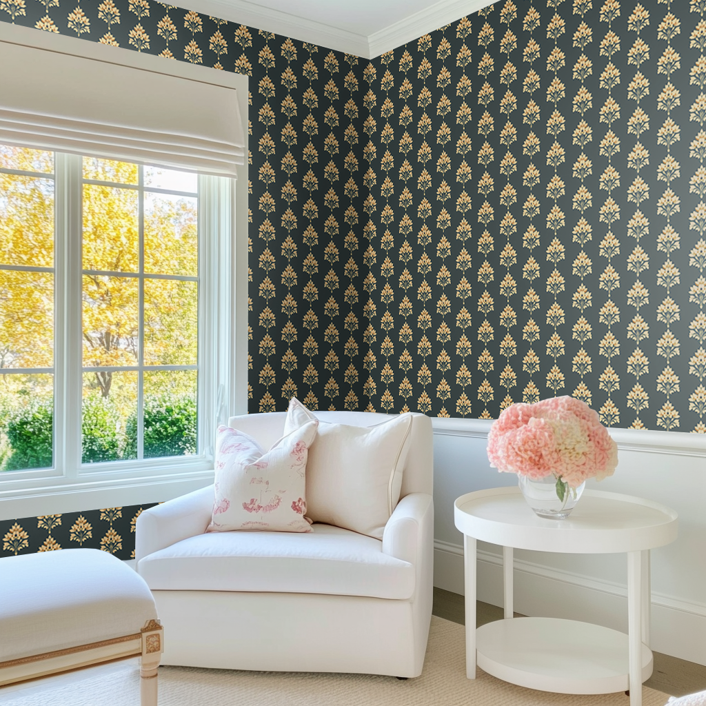 Graham is a stately wallpaper that blends classic damask elegance with a modern edge, featuring bold golden florals set against a rich midnight backdrop. The symmetrical motif and striking contrast create a sense of grandeur and depth, perfect for elevating formal dining rooms, libraries, or dramatic entryways. Graham’s timeless sophistication makes it a statement-making choice for those who appreciate enduring style.