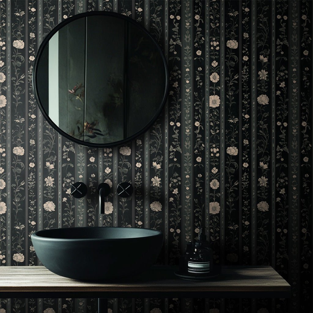 Green Dahlia features a refined botanical design in a vertical striped layout, set against a rich, dark background. Each stripe showcases delicate floral motifs in muted beige and green tones, creating a sophisticated vintage look. The symmetrical arrangement of flowers and leaves along the stripes adds an elegant, orderly rhythm, while the subtle detailing of each bloom brings a touch of timeless charm. Ideal for adding understated luxury to any room, this wallpaper would enhance traditional, classic, or contemporary interiors, making it perfect for dining rooms, study spaces, or accent walls.