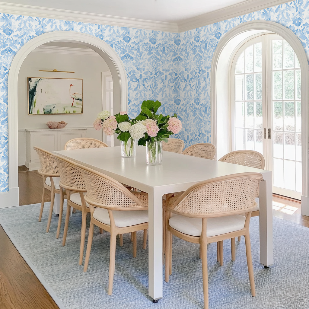 Bold, breezy, and totally modern — Hauffney is a watercolor-style pattern that feels playful and painterly. The vibrant blue tones add movement and light, making it a standout moment on any wall.