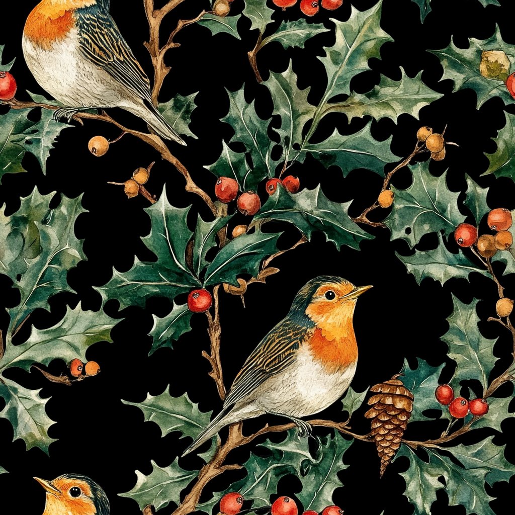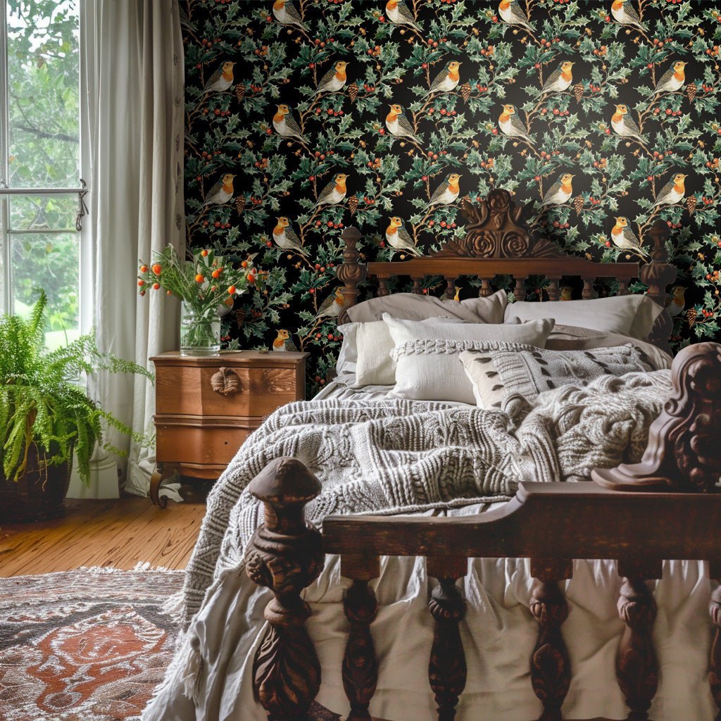 Our Heath Wallpaper is beautifully festive design featuring charming robins perched among holly branches with bright berries, set against a rich, dark background. Perfect for bringing a touch of seasonal warmth and natural elegance to any space.