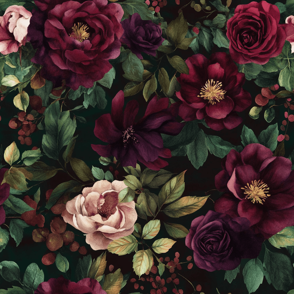Dramatic and luxurious, the Hermes Wallpaper features a lush arrangement of deep red and burgundy florals against a shadowy black backdrop. The opulent color scheme exudes sophistication, making it a statement piece in any room. Perfect for those who love bold, moody interiors with a romantic edge. This wallpaper is ideal for creating an intimate, elegant ambiance in dining rooms or lounges.