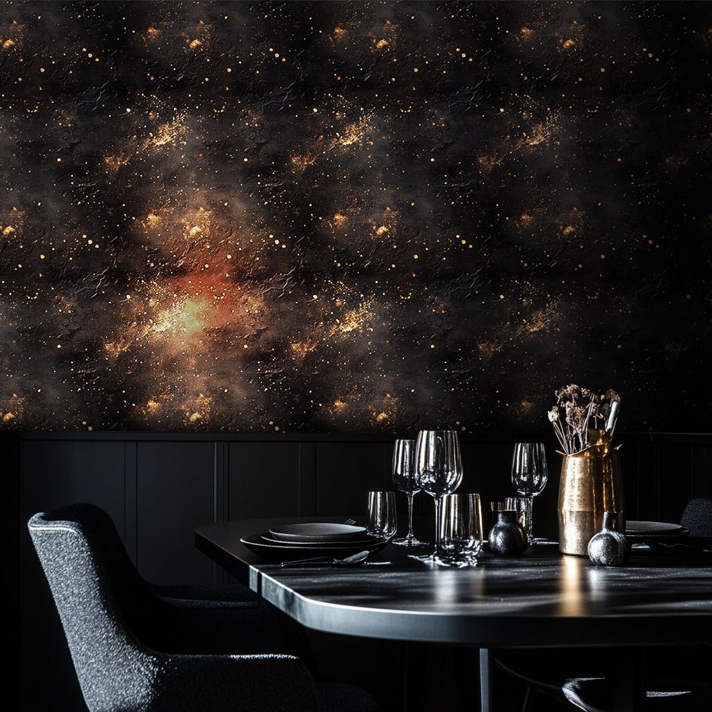 This stunning wallpaper features a deep black background with golden flecks, resembling a cosmic galaxy. The luxurious, moody aesthetic is perfect for creating an elegant and mysterious ambiance. The subtle metallic accents catch the light beautifully, adding depth and dimension. Ideal for a modern space seeking a bold yet refined touch.
