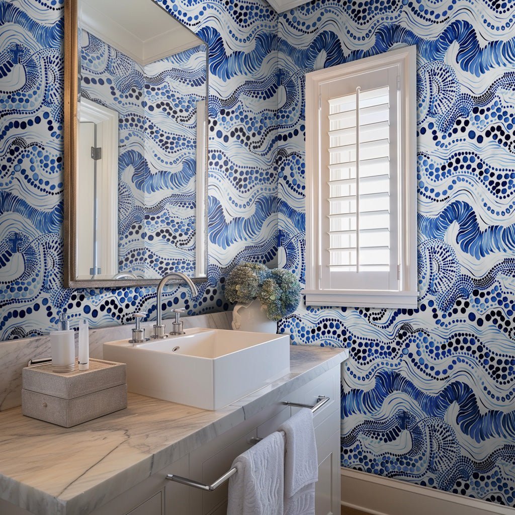 Embrace timeless elegance with 'Ivran,' a sophisticated white wallpaper adorned with a captivating blue pattern reminiscent of gentle wakes, adding a touch of coastal charm to your décor.