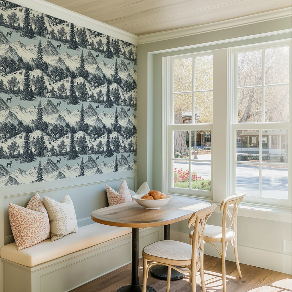 Bring the magic of winter indoors with this Lake Louise Wallpaper featuring serene snow-covered mountains and graceful deer in a playful black and blue palette. Perfect for creating a cozy and whimsical atmosphere, it turns any room into a snowy adventure filled with charm and calm.