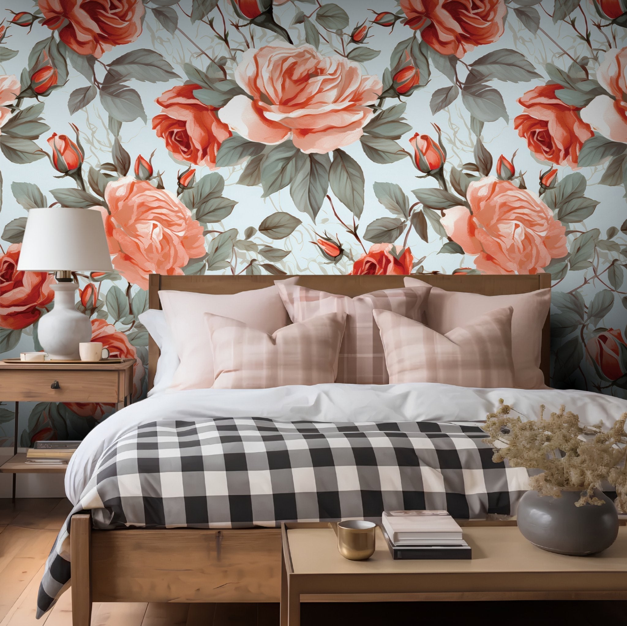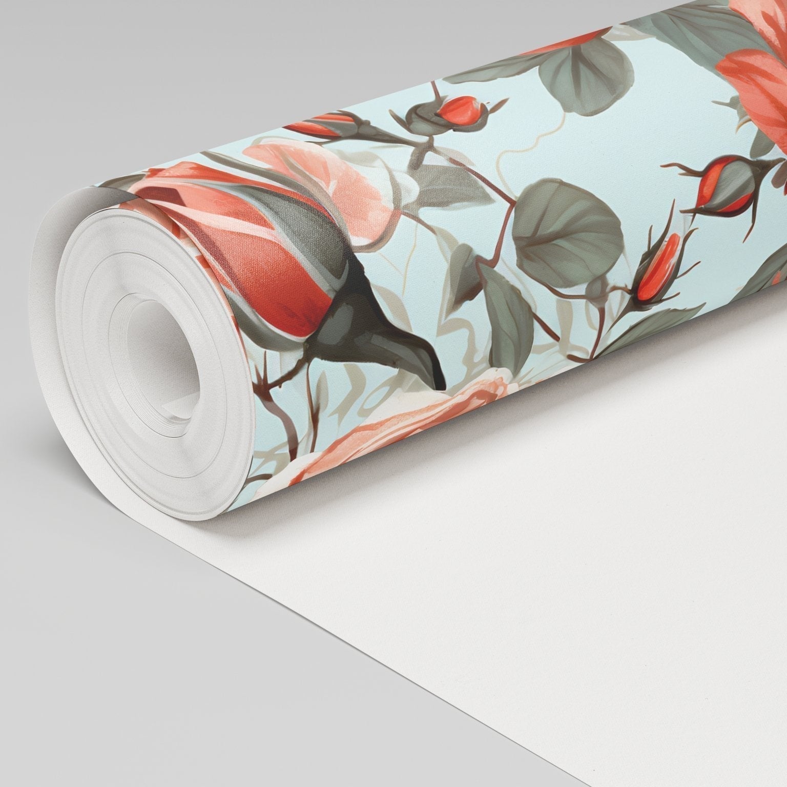 Our Laken Floral Wallpaper is a timeless ode to nature's elegance. Against a sophisticated blue background, this wallpaper showcases roses in the style of light pink and light emerald, drawing inspiration from the vintage imagery. The nature-based patterns, layered in light red and light blue, evoke a sense of classic charm. Inspired by the aquarellist tradition, this wallpaper captures the fluid grace of watercolors, creating a visually stunning composition.Â