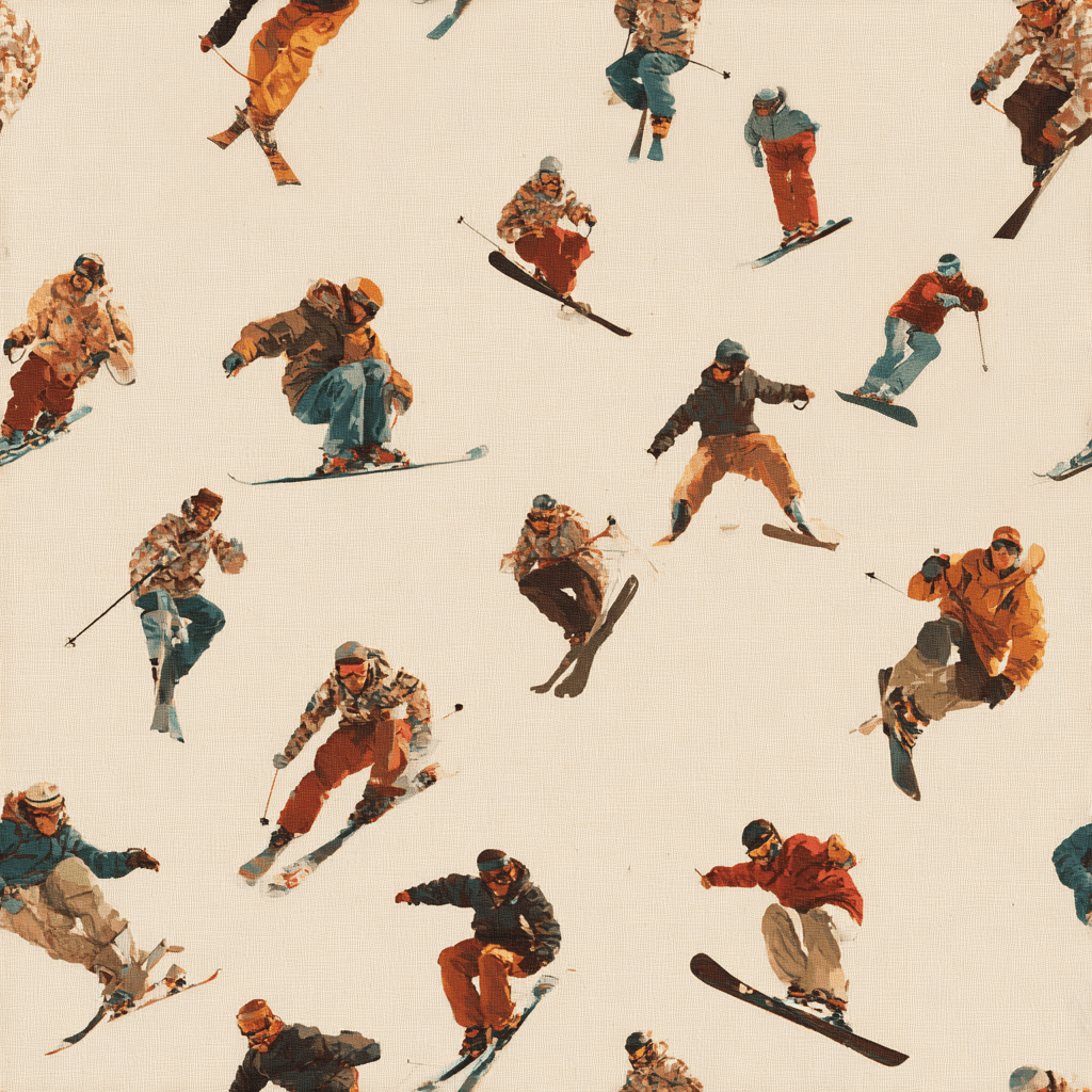 Landon captures the spirit of winter adventure with beautiful skiers and snowboarders in motion across a warm neutral ground. The dynamic composition and vintage-inspired palette evoke alpine heritage, creating a design that feels both playful and refined.