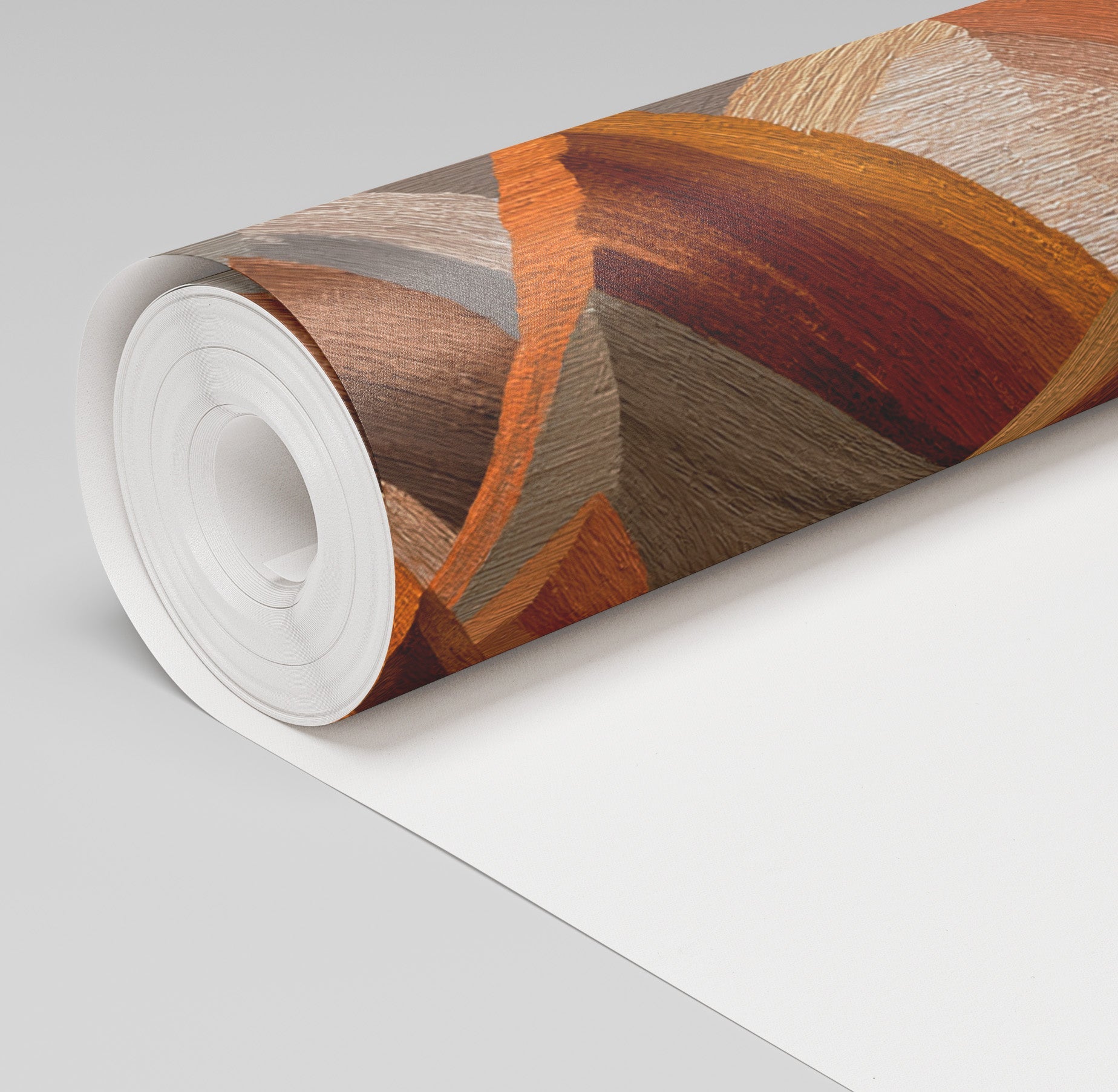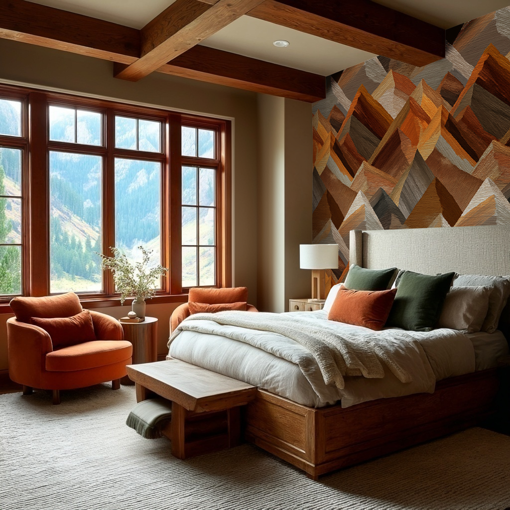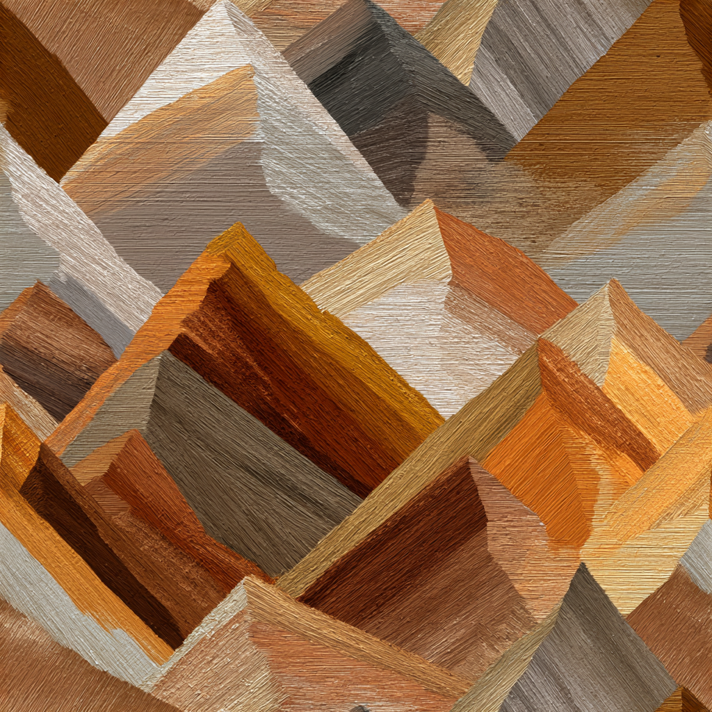 Leland is a geometric mountain wallpaper created with bold, angular brushstrokes. The layered peaks appear in warm tones of rust, ochre, taupe, and clay, giving the design a textured, painterly effect. Abstract yet grounded in natural shapes, it captures the rugged feel of rocky terrain. A striking choice for feature walls, it adds depth and warmth to any space.