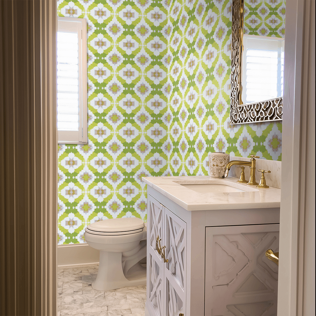 Lemongrass Lace is a fresh take on Neoclassical design, blending symmetry and softness in a modern watercolor style. This seamless pattern features intricate lace-like motifs in lime green set against a crisp white background, primarily concentrated at the base of the design. With its airy, organic feel and classical structure, it brings an elegant yet playful touch to spaces in need of refinement and energy. Perfect for accent walls, powder rooms, or sunlit corners craving a hint of botanical brightness.