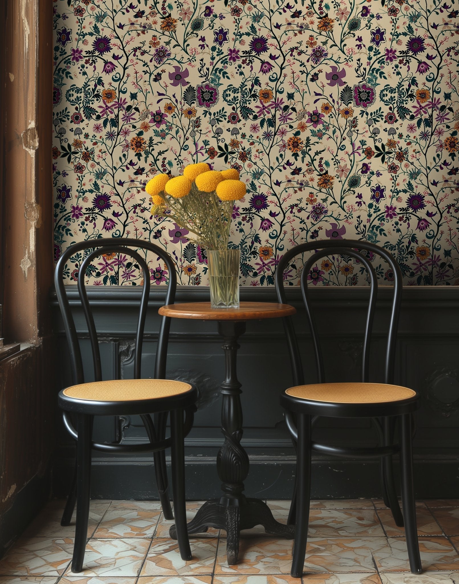 The Liddy Jo Floral pattern is a celebration of nature's playful side, featuring a vibrant medley of colorful flowers, sprightly fauna, and fluttering butterflies, all interwoven in a lively dance across a soft, cream canvas. Each brushstroke evokes the artisan's touch, bringing a bespoke elegance to any room. Ideal for those seeking to add a burst of life and color to their decor, this wallpaper promises to be a conversation starter and a source of daily joy.