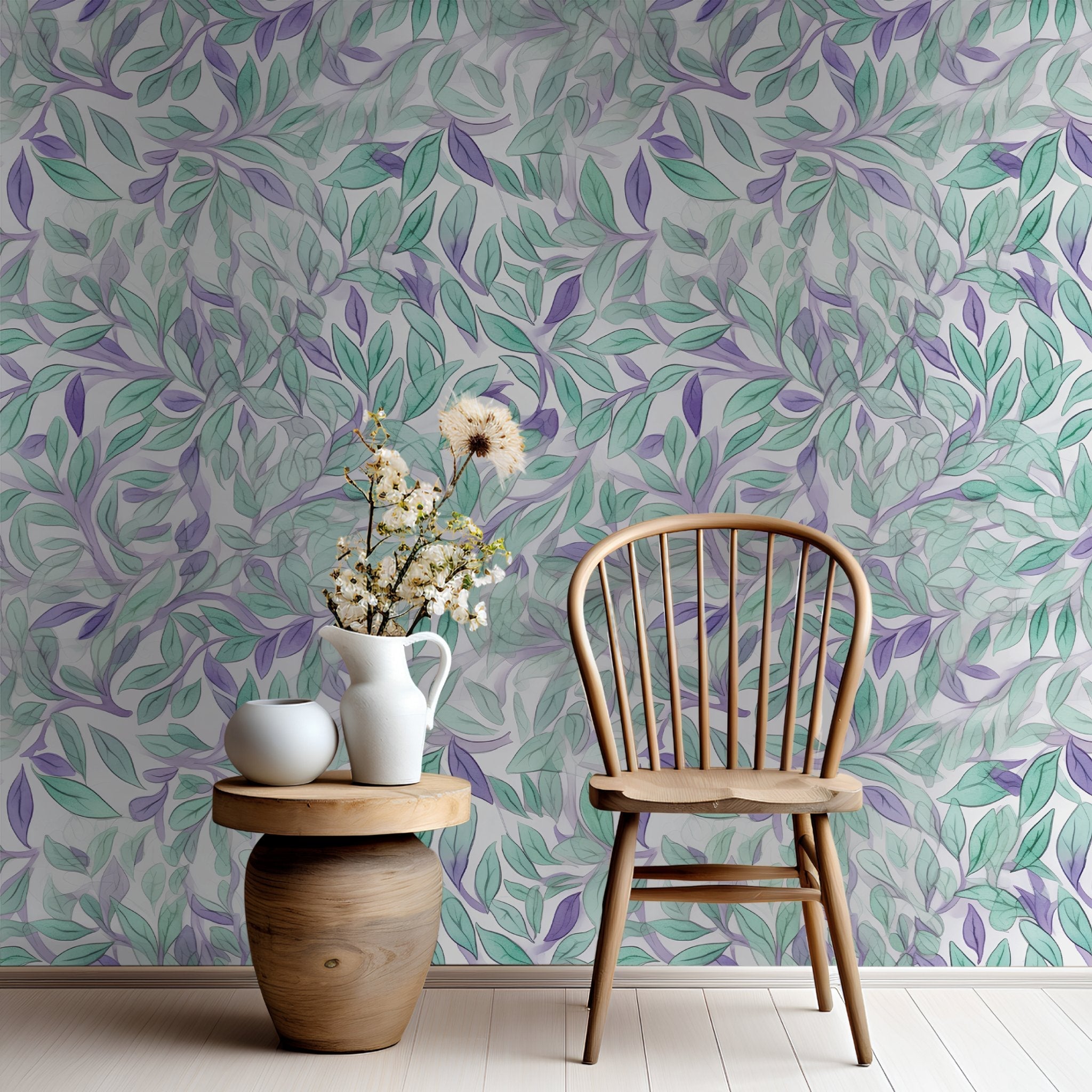 Our Livia Floral Wallpaper features leaf patterns in a palette of light violet and light green, the wallpaper captures the essence of nature, enhanced by fine lines and intricate details reminiscent of twisted branches.Â