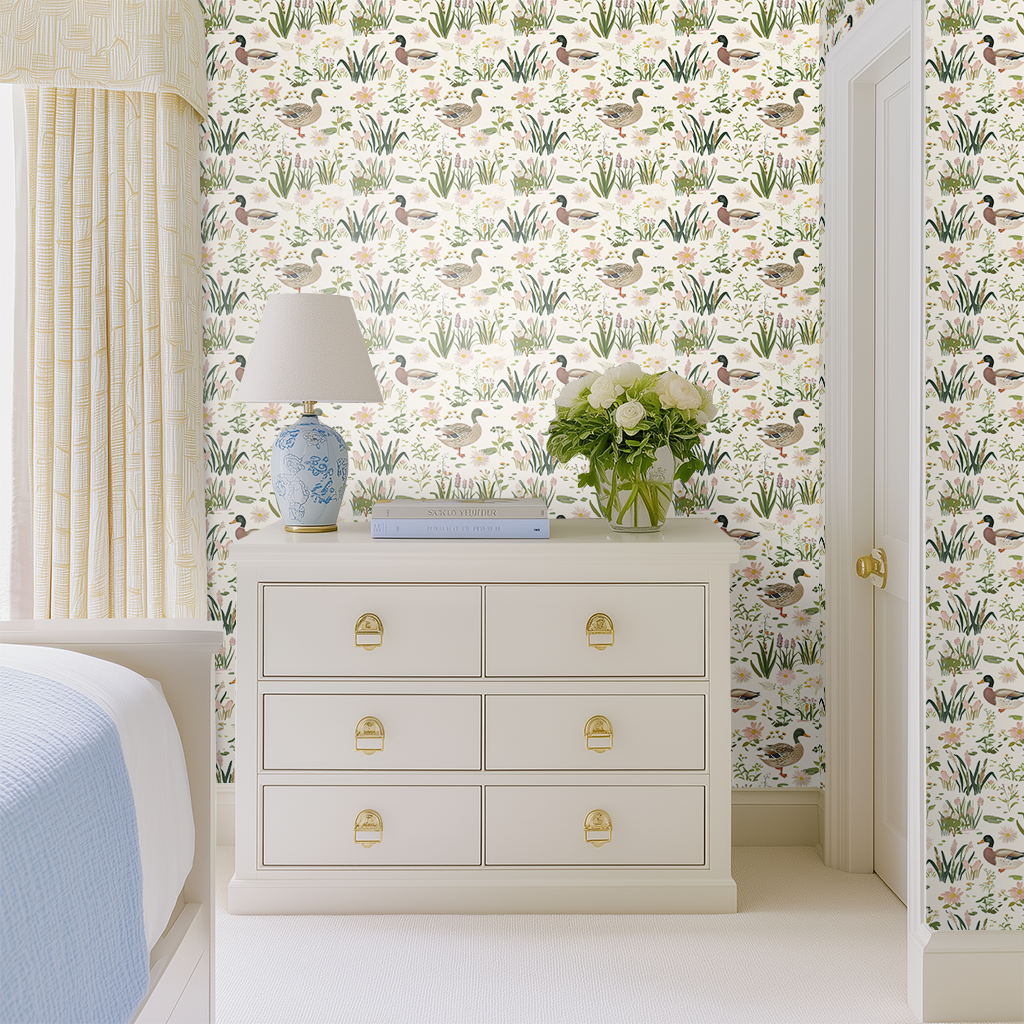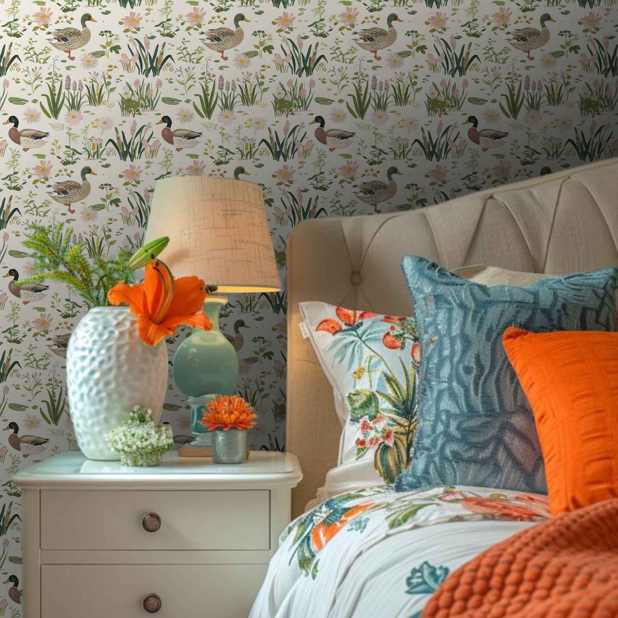 "Mallard Meadow" Serenity takes wing in this pastoral scene, where mallard ducks glide gracefully among a bloom of wildflowers. This wallpaper is a tranquil reflection of a sunny day by the pond, perfect for anyone seeking to bring the quiet charm of nature into their nest.