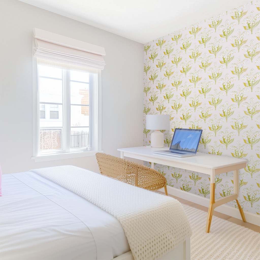 Watercolor clusters of flowers rest against a pale pink ground, their delicate white blooms and warm green leaves creating a fresh, romantic look. Perfect for adding charm and serenity to any space.