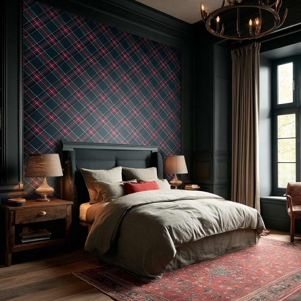 Merritt is a plaid wallpaper in deep navy, hunter green, and burgundy tones with fine cream accents. The crisscrossing lines create a classic tartan effect, adding structure and warmth to a space. Traditional but bold in scale, it’s a versatile choice for dens, offices, or accent walls.