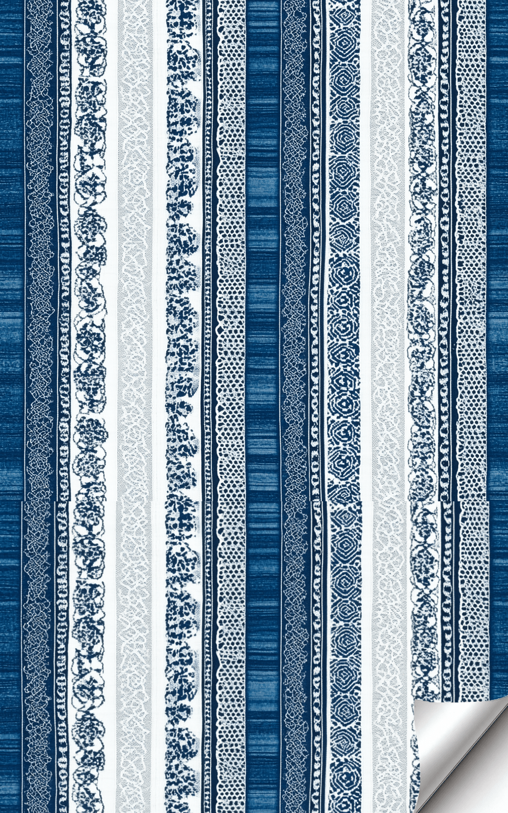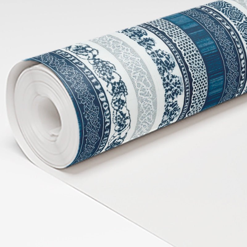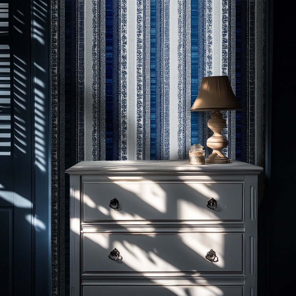 Mikaelson blends traditional charm with a modern sensibility through its vertical stripes adorned with intricate blue and white patterns. Reminiscent of classic toile or fine china, this design offers a timeless aesthetic that feels both fresh and familiar. The alternating bands of decorative detailing and crisp white space create a visually appealing rhythm. Ideal for formal dining rooms, powder rooms, or even a cozy reading nook, Mikaelson adds an air of refined sophistication.