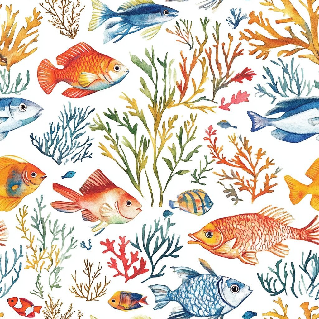 Introducing the "Nina" wallpaper design; a delightful underwater wonderland filled with a vibrant medley of colorful fish and lush coral branches. Each element is painted in bright, cheerful hues that dance across the surface, capturing the playful spirit of a bustling coral reef. Perfect for adding a touch of whimsy and oceanic charm to any room, "Nina" brings the beauty and diversity of the sea to your walls, transforming your space into a lively aquatic paradise.