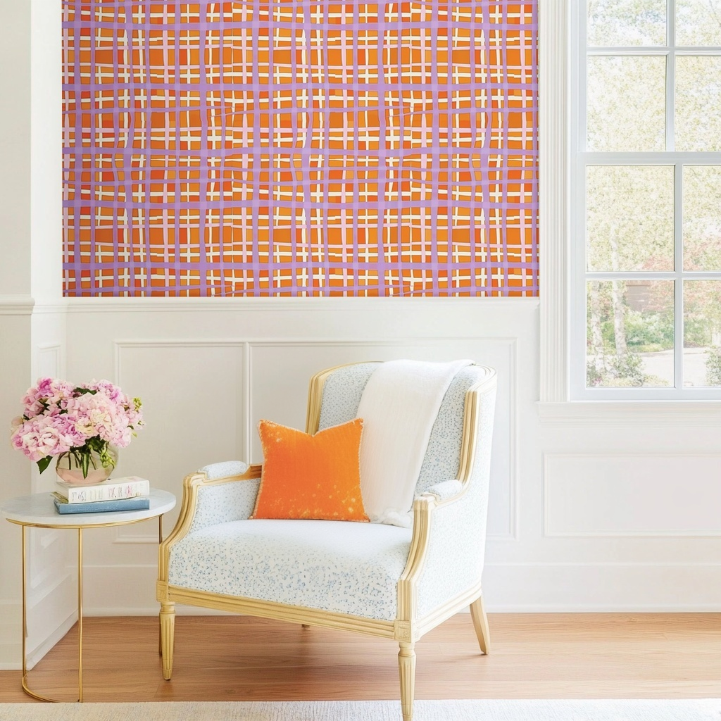 Slip into a summer state of mind with "Peachy Gridlock," where vibrant orange squares dance across a soft lavender backdrop. It's the ultimate blend of playful chaos and sweet, structured bliss for your space.