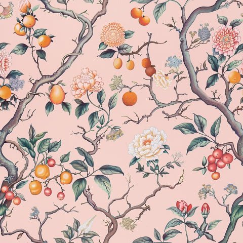 Bring a vibrant touch of nature indoors with our Penelope Wallpaper. This lively design features an array of blossoming flowers and fruit branches on a soft pink background, perfect for adding a cheerful and artistic flair to any space.