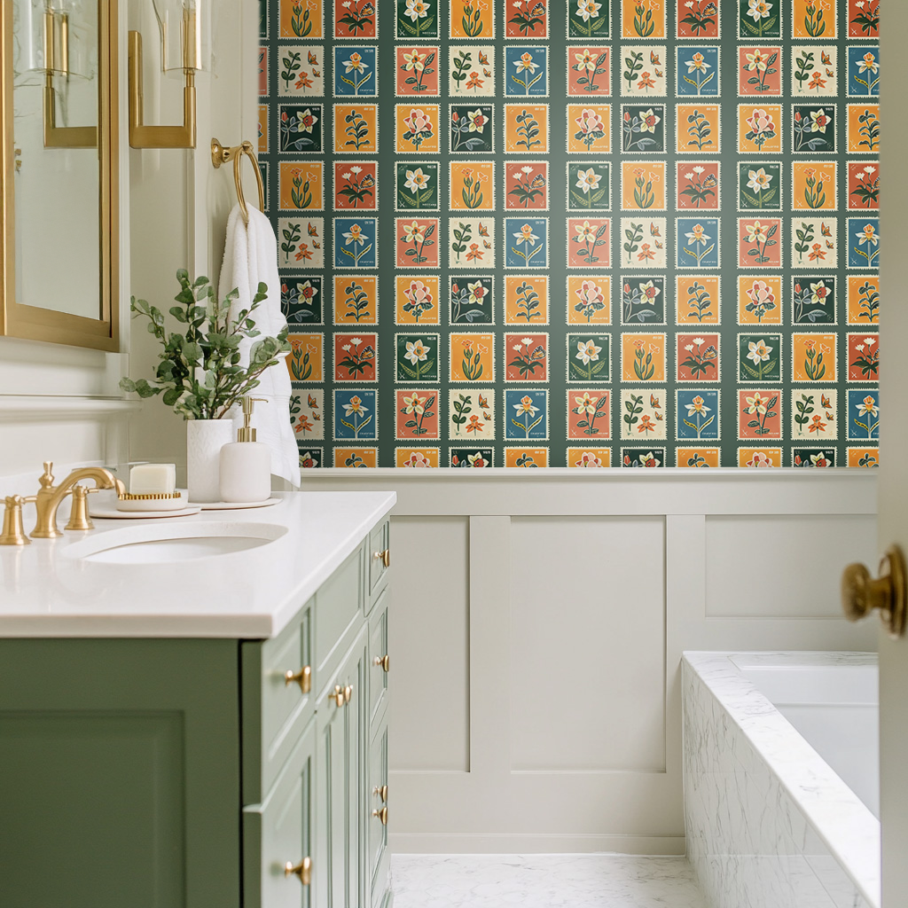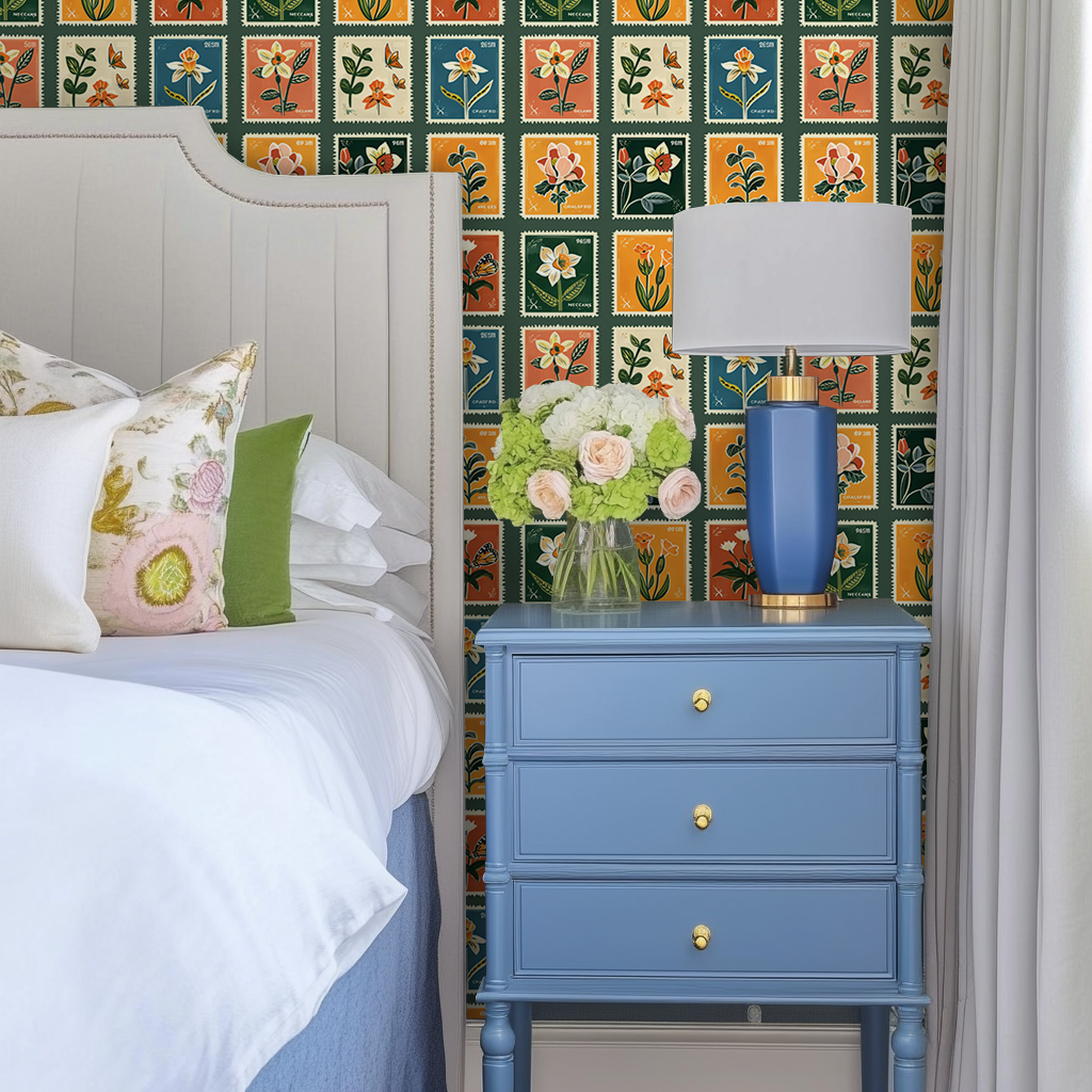 "Penelope's Postage" a charming collection of botanical postage stamps, each a miniature canvas celebrating the art of epistolary elegance. This wallpaper is a stamp collector's daydream, perfect for adding a touch of whimsical nostalgia to the abode of a modern-day romantic.
