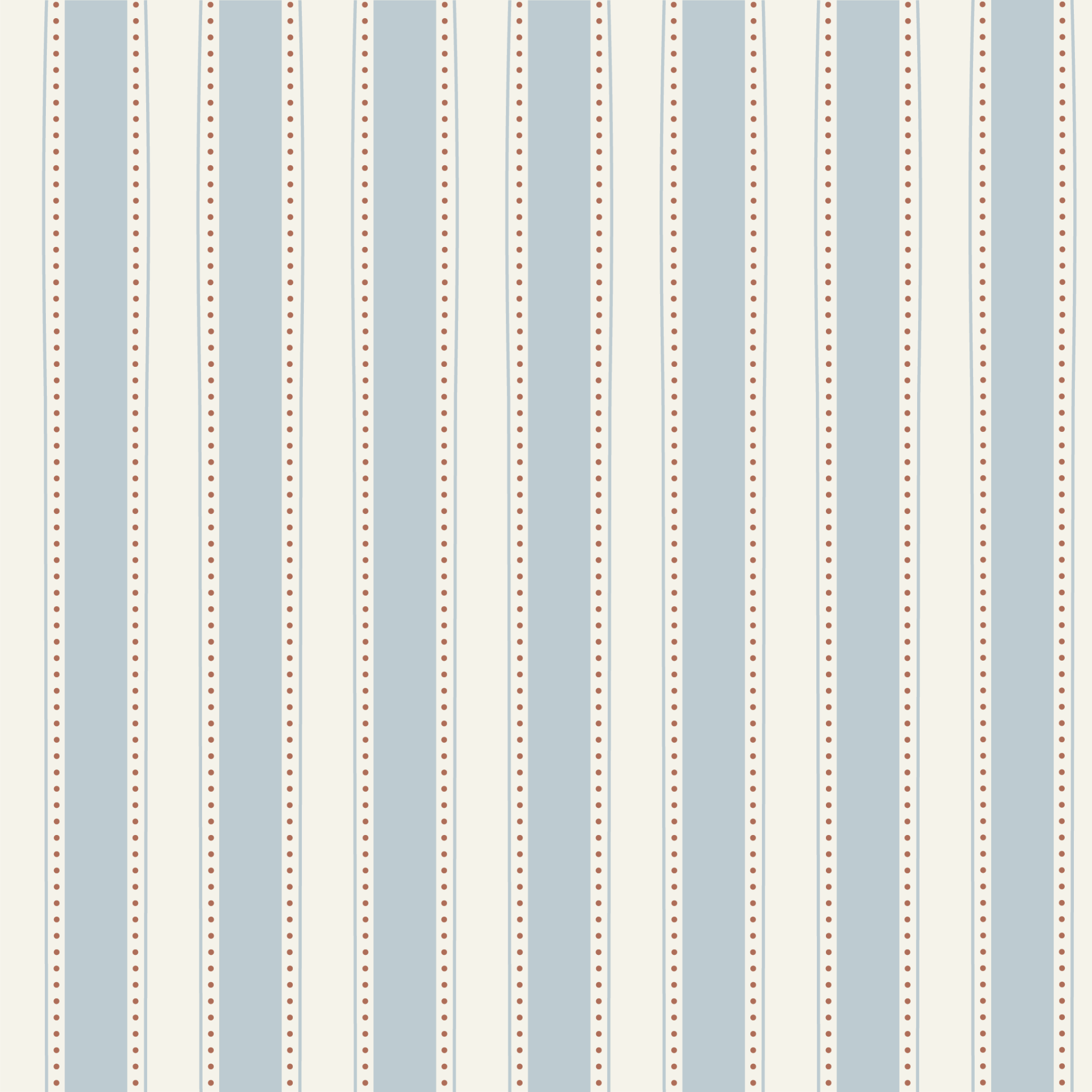 This charming new design features soft blue and ivory vertical stripes accented with playful dotted borders in a warm terracotta tone. The slightly wavy lines give it a hand-drawn, relaxed feel; perfect for bringing a cozy, whimsical touch to your space.